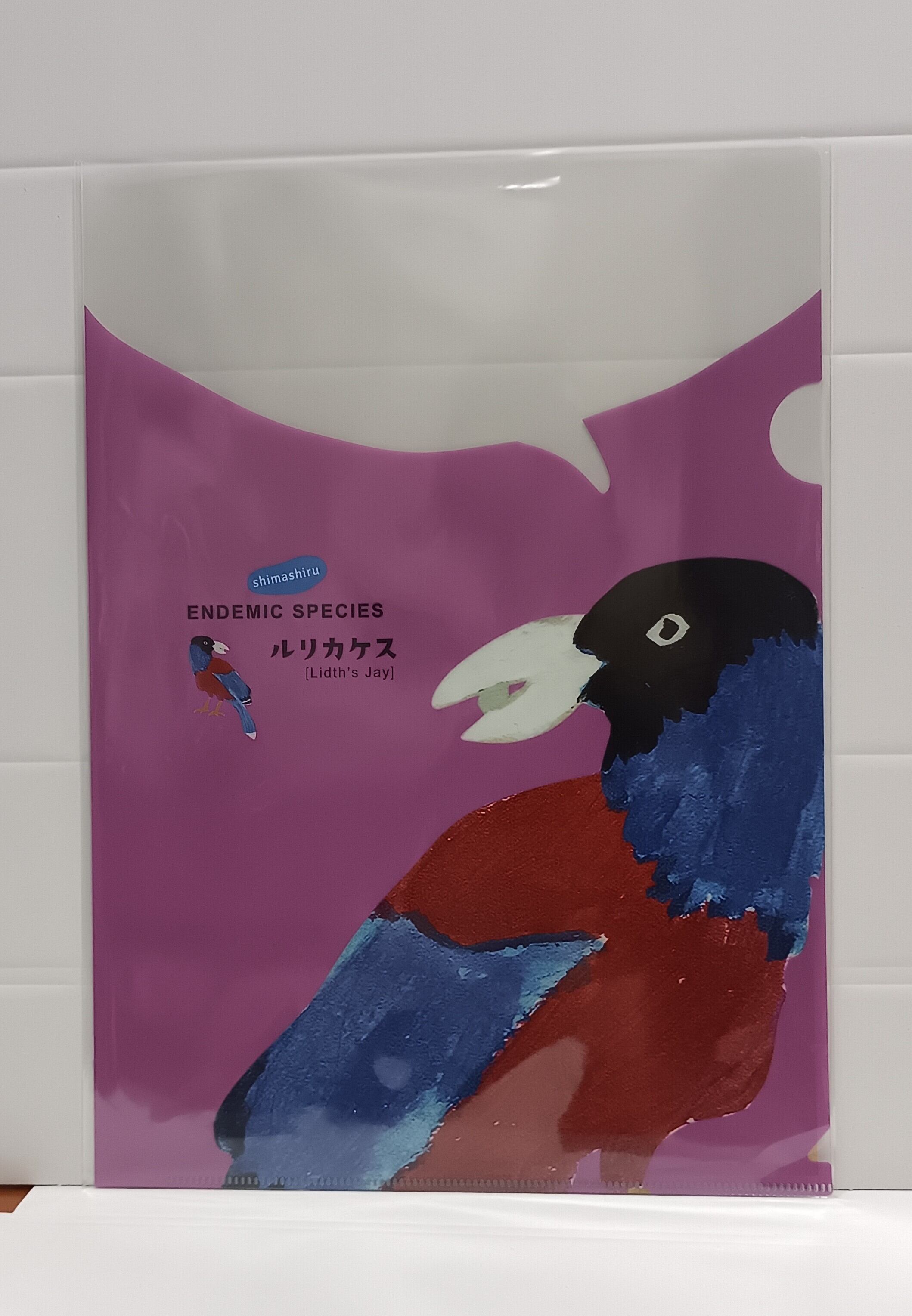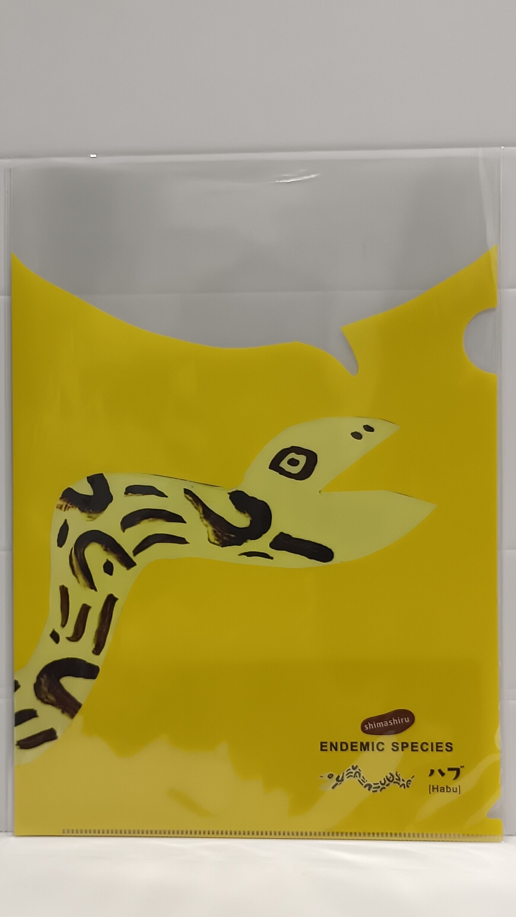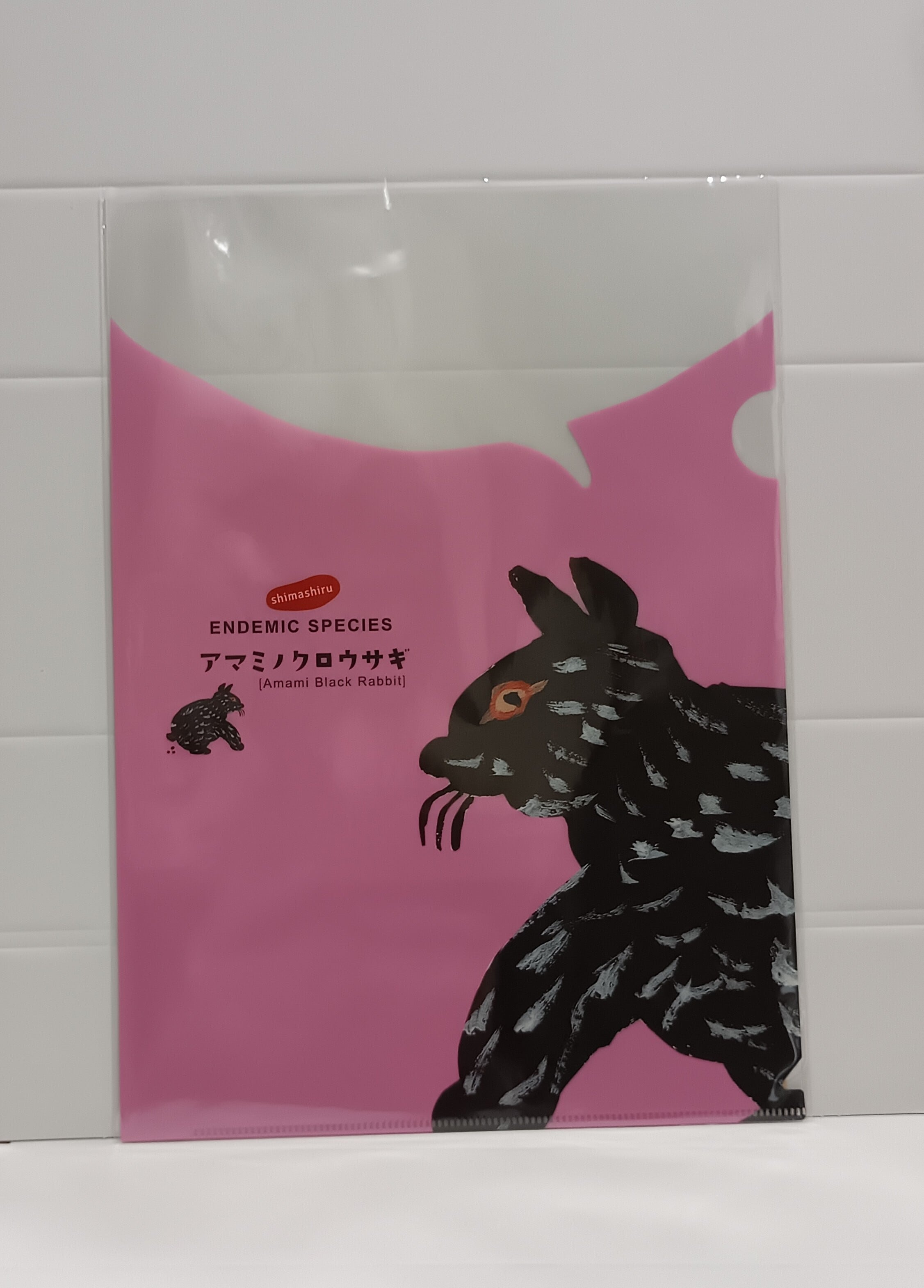世界遺産の島に棲む生き物たちが大胆に描かれたポップなクリアファイル4枚(A4サイズ)と、固い表紙が使い勝手バツグンの手帳「アマミノクロウサギシマ帳 縦約165㎜×横約95㎜×厚さ6㎜ メモ部部は方眼紙40枚」1冊のセットです
