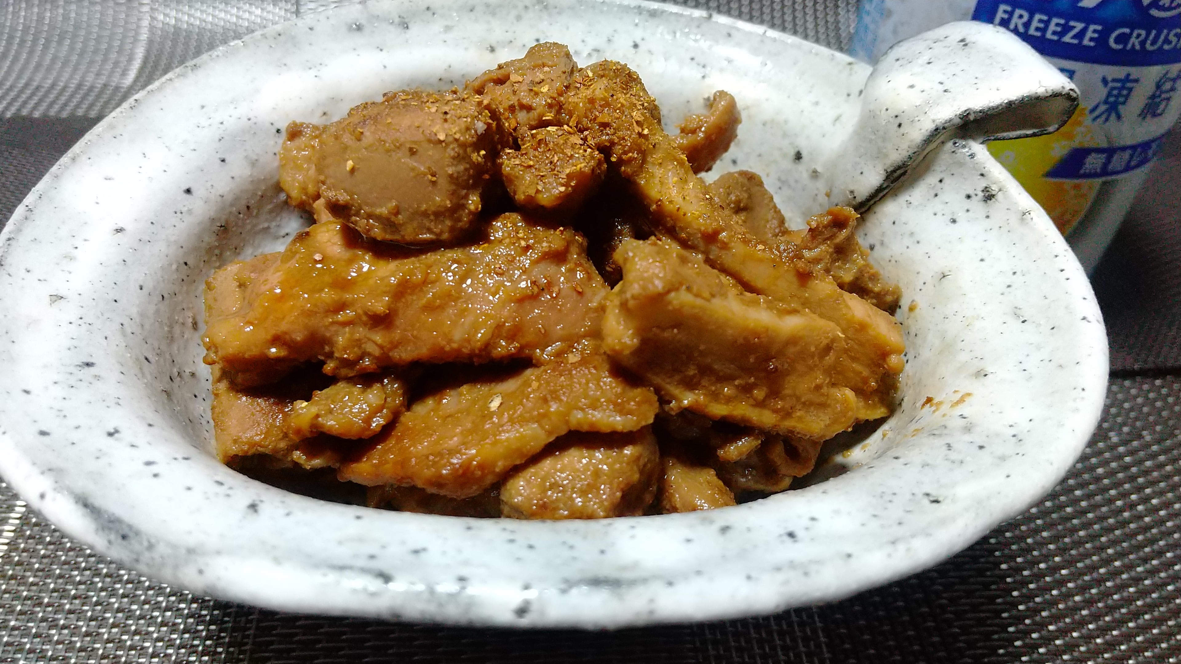 鹿児島県鹿屋市吾平産「鎌田黒豚農場」の六白黒豚のホルモン(小腸・大腸・ハラミ・タン・ハツ・ガツ・レバー・テッポウ・頭ホホ肉・トントロ)をみそダレで味付けした一品です。